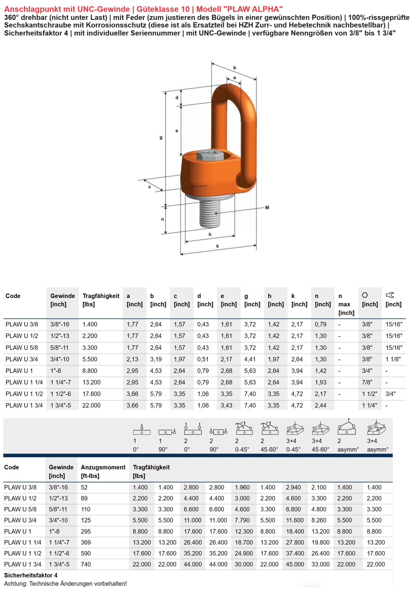 Startseite » IV. Anschlagpunkte » a) Anschlagwirbel » Anschlagwirbel mit Bügel | GK 10 | UNC-Gewinde | Modell "PLAW-UNC"