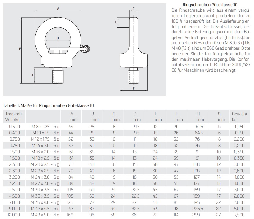 - Verfügbare, metrische Gewindegrößen: M8 bis M48 und Tragfähigkeiten von 300 kg bis 12.000 kg (90°)