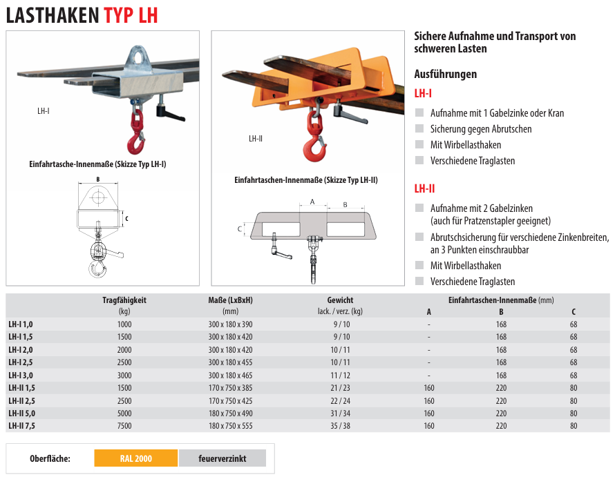 Startseite » XII. Hebezeuge » k) Stapler-Anbaugeräte | Arbeitsbühnen | Behälter » Staplerlasthaken LH-II
