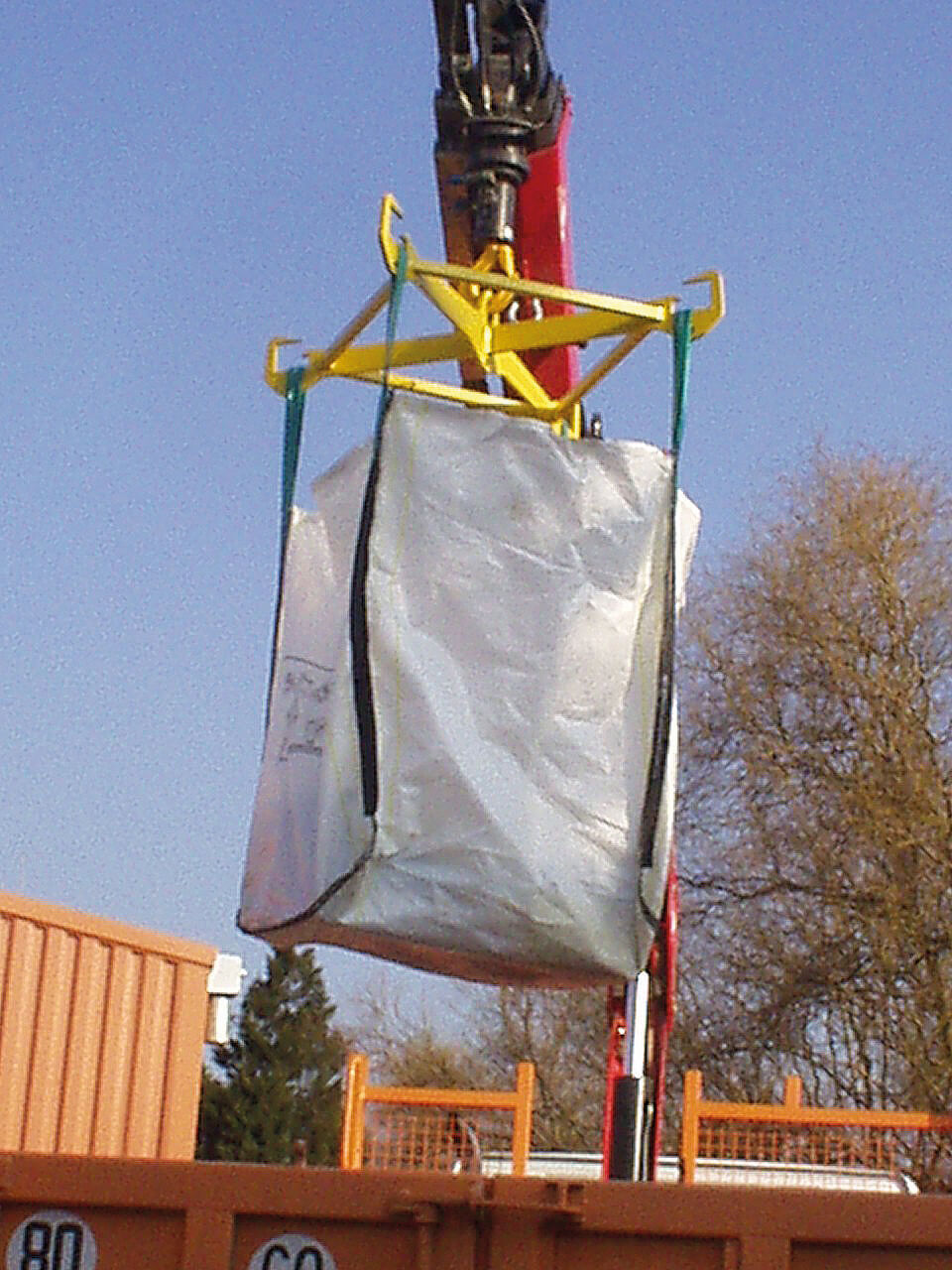 - Produktpalette von X-förmigen Traversen, die mit 4 Auflageflächen zum Anheben von Weichcontainern ausgestattet sind, wie z. B. Big-Bag mit 4 Hebepunkten, die eckig oder diagonal angeordnet sind