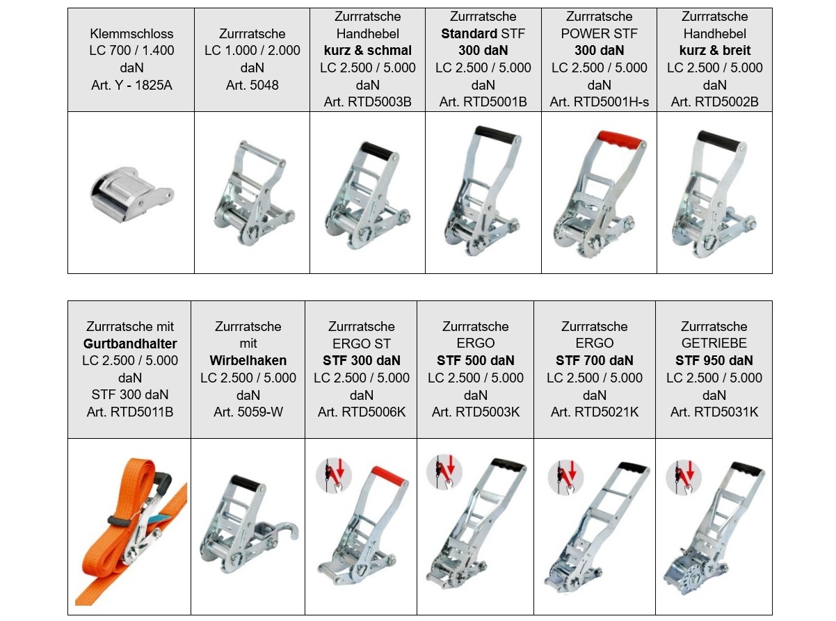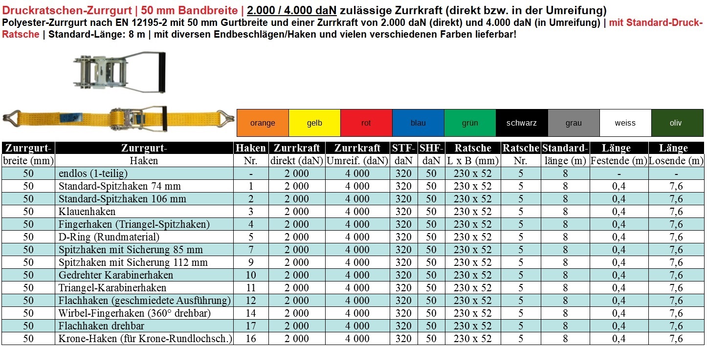 50 mm Zurrgurte mit geringer Zurrkraft und kompakter, kleiner Ratsche (1.000/2.000 daN zul. Zurrkraft) bis hin zu LKW-Zurrgurten mit 2.000/4.000 daN oder 2.500/5.000 daN zul. Zurrkraft und wahlweise mit Standard-Druckratsche (300 daN STF), Ergo-Langhebel-Zugratsche (500 und 700 daN STF) oder mit Getriebe-Ratsche der neuesten Generation mit maximaler Vorspannkraft von 950 daN STF!Viele unterschiedliche Bandfarben, Längen und auf Wunsch mit Bedruckung mit diversen Druckfarben!