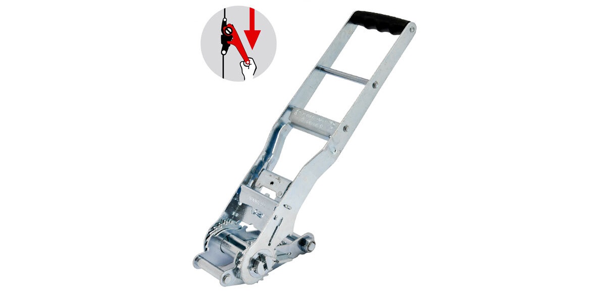 Zurrgurt mit Langhebel-ERGO-Zugratsche mit Doppelzahnkranz und 700 daN STF Vorspannkraft und gleichschenkliger Triangel